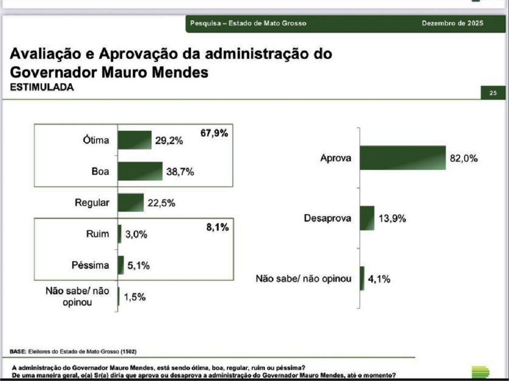O levantamento ouviu 1.502 mato-grossenses, de 61 municípios, com idades entre 16 e 60 anos. As entrevistas foram realizadas entre os dias 12 e 16 de dezembro. O nível de confiança é de 95%, com margem de erro de cerca de 2,6 pontos percentuais para os resultados gerais.