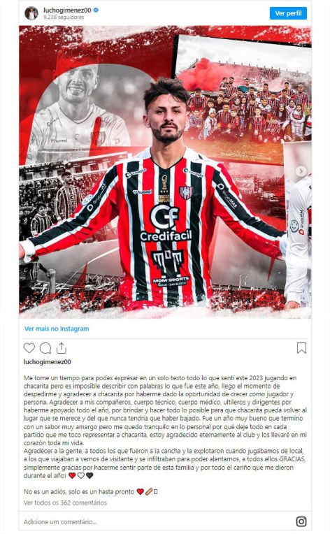 – Demorei algum tempo para expressar num só texto tudo o que senti em 2023 jogando no Chacarita, mas é impossível descrever por palavras o que foi este ano. Chegou o momento de me despedir e agradecer ao Chacarita por me ter dado a oportunidade de crescer como jogador e pessoa. Agradecer aos meus companheiros de equipe, comissão técnica, equipe médica, funcionários e dirigentes por terem me apoiado durante todo o ano, para proporcionar e fazer todo o possível para que o Chacarita possa voltar ao lugar que merece e que nunca deveria ter descido – escreveu.