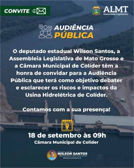 A Assembleia Legislativa de Mato Grosso, por meio do deputado estadual Wilson Santos (PSD), em parceria com a Câmara de Vereadores de Colíder, promove nesta quinta-feira (18), às 9h, na Câmara Municipal de Colíder, uma audiência pública para debater os impactos ambientais e socioeconômicos decorrentes da Usina Hidrelétrica (UHE) Colíder. O encontro reunirá representantes de órgãos reguladores, autoridades políticas, lideranças regionais, pescadores, ribeirinhos e sociedade civil.