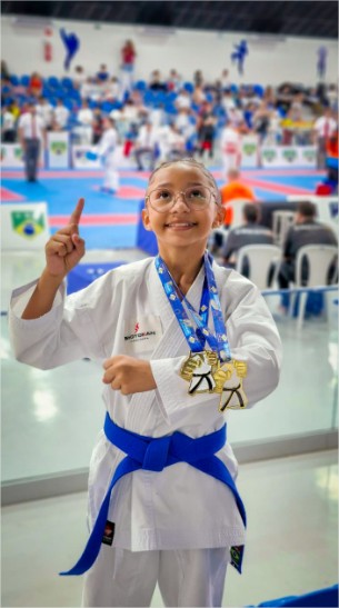 “Estou muito feliz. Foi um campeonato bem difícil porque eu estava me recuperando de uma lesão e sabia que enfrentaria adversárias fortes. Mas dei o meu melhor. Ver o resultado acontecendo me deixou orgulhosa e motivada. Este é meu segundo ano participando e agora sou bicampeã em kata individual sub-12 e campeã em kumitê sub-12 -35 kg. Quero continuar evoluindo, aprendendo mais e representar bem meu Estado e meu país nos próximos campeonatos. Agradeço meus senseis por todo treino e ensinamento e à equipe Shotokan. Agora é girar a chave, como diz o sensei Rodrigo, e focar no Pan-Americano da semana que vem, em Natal.”