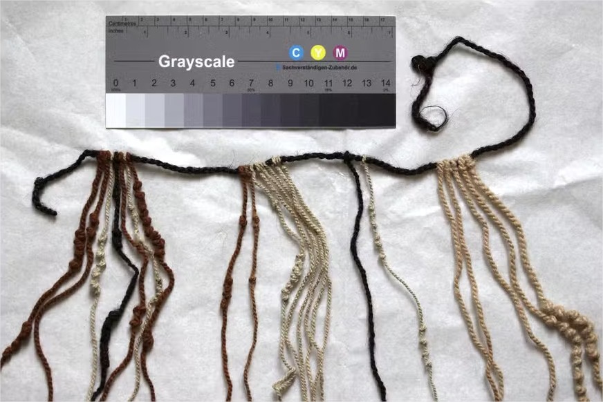 Ao contrário do padrão de cordões feitos de lã de lhama ou alpaca, este cordão principal era feito inteiramente de cabelo humano: um fio de 104 centímetros, dobrado e torcido. A equipe responsável pelo achado acredita se tratar de um material com profundo significado simbólico no mundo andino, carregando a “essência” de quem o doou.