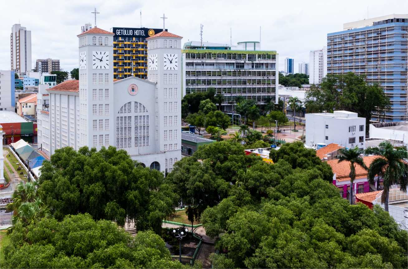 A foto mostra em primeiro plano a Catedral Basílica do Senhor Bom Jesus; ao fundo está o prédio do Palácio Alencastro, sede da Prefeitura de Cuiabá.