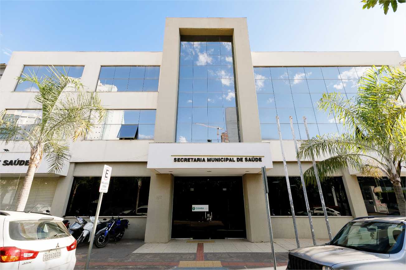 A foto ilustra a fachada da Secretaria Municipal de Saúde (SMS). Trata-se de um prédio de cor bege com vidros na parte superior.
