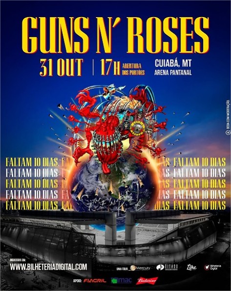 A banda Guns N’ Roses se apresenta pela primeira vez em Cuiabá no dia 31 de outubro de 2025, na Arena Pantanal, como parte da turnê mundial “Because What You Want and What You Get Are Two Completely Different Things”. O evento é produzido pela Mercury Concerts com coprodução da Ditado Produções e promete reunir até 49 mil pessoas, com ingressos entre R$ 650 e R$ 770.