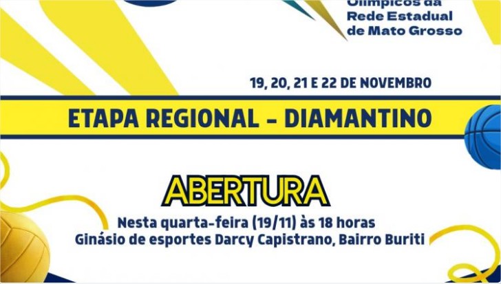 Diamantino recebe, entre os dias 19 e 22 de novembro, a etapa regional dos 1º Jogos Olímpicos da Rede Estadual de Educação de Mato Grosso (JORE). A cerimônia de abertura será realizada nesta quarta-feira (19.11), às 19h, no Ginásio Poliesportivo Darcy Capistrano, no bairro Buriti.