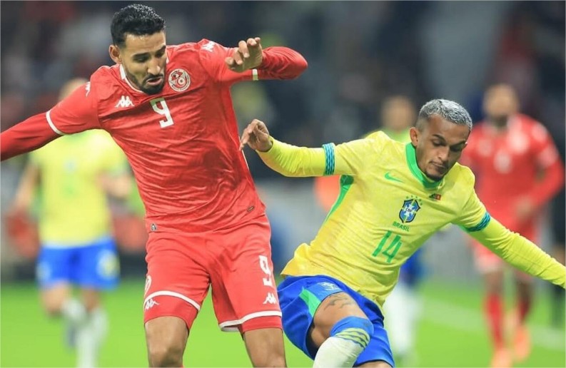 Mesmo em campo neutro, a torcida tunisiana era maioria, fazendo bastante barulho e utilizando sinalizadores. No entanto, a primeira boa chegada do jogo foi com a Seleção Brasileira. Casemiro tocou mal para Rodrygo, que deu sorte após erro do defensor, aos 9′. O atacante do Real Madrid chutou de esquerda, mas parou no zagueiro Talbi, que tirou praticamente em cima da linha. Estêvão, em cobrança de falta direta, obrigou Dahmen a trabalhar pouco depois, aos 11′.