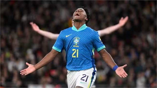 Endrick comemora gol em Inglaterra x Brasil (Foto: André Durão)