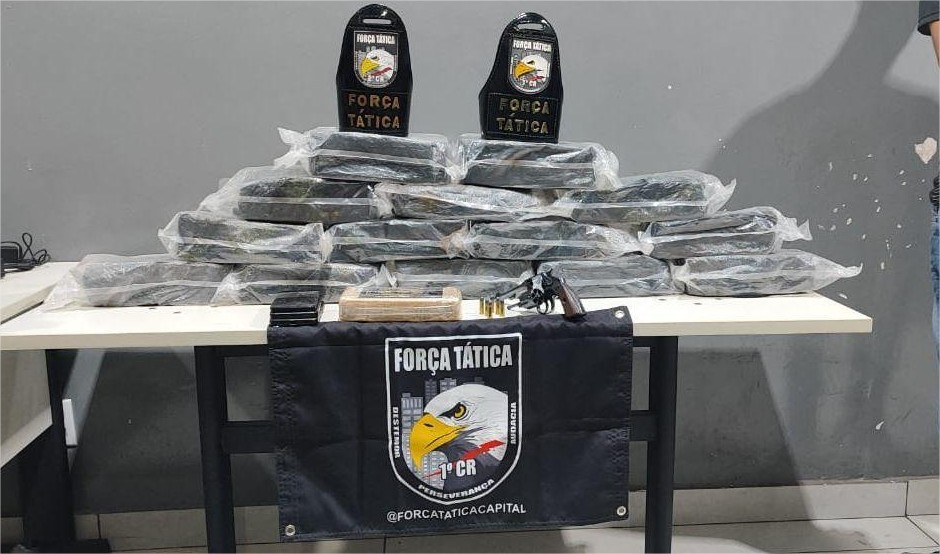 Com os criminosos detidos, foram encontrados 14 tabletes de substância análoga a supermaconha (skank) e um tablete de pasta base de cocaína. Também foi localizado um revólver de calibre .32 carregado com seis munições.