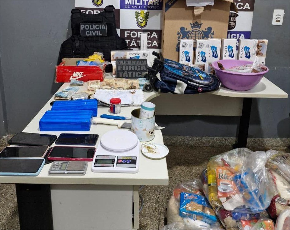 Policiais militares da Força Tática do 4º Comando Regional prenderam uma mulher, de 23 anos, e um homem, de 33 anos, por tráfico de drogas, na tarde desta quarta-feira (29.10), em Rondonópolis. Com os suspeitos foram encontrados três tabletes de maconha e cocaína, 58 cestas básicas, pouco mais de R$ 13 mil em dinheiro e uma paca abatida.