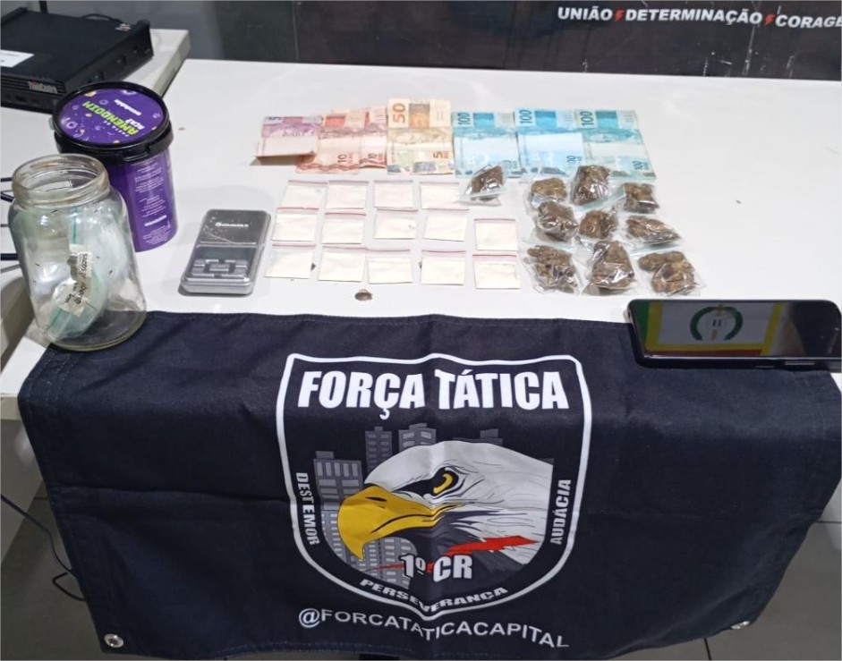 Policiais militares da Força Tática do 1º Comando Regional prenderam um homem, de 25 anos, por tráfico ilícito de drogas, nesta terça-feira (18.11), em Várzea Grande. Com o suspeito, foram apreendidas dez porções de maconha e 14 porções de cocaína, e uma quantia de R$375,00 em dinheiro.