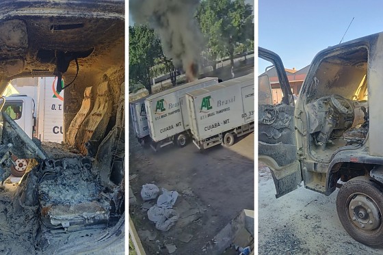 Nas imagens, o suspeito chega de moto, estaciona na calçada e entra por um portão aberto, sem encontrar resistência. Ele caminha até a área dos caminhões e incendeia um dos veículos, fugindo logo em seguida.