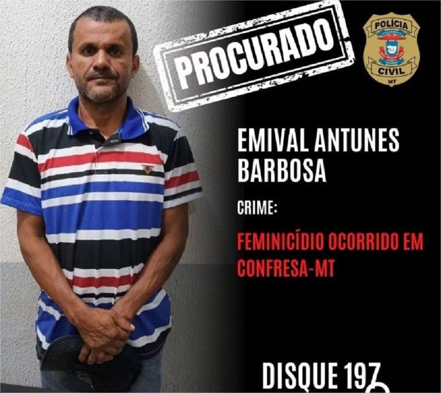 O homem suspeito de esfaquear a esposa no pescoço em um bar de Confresa, a 1.160 km de Cuiabá, foi preso nessa quinta-feira (30). Emival Antunes Barbosa, de 47 anos, estava foragido desde o mesmo dia do crime. Ele esfaqueou a vítima enquanto ela estava com uma das filhas do casal no colo.