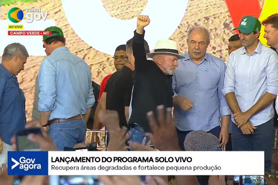 O presidente Lula (PT) foi ovacionado pelos seus apoiadores na manhã deste sábado (24)  durante o lançamento do programa Solo Vivo, em Campo Verde (135 km de Cuiabá). Ao surgir no palco do evento, os petistas entoaram o coro “Olê, olê, olê, olá, Lula, Lula!”, e gritos de “sem anistia”, em referência ao possível pedido de perdão aos condenados pelos atos golpistas de 8 de janeiro.