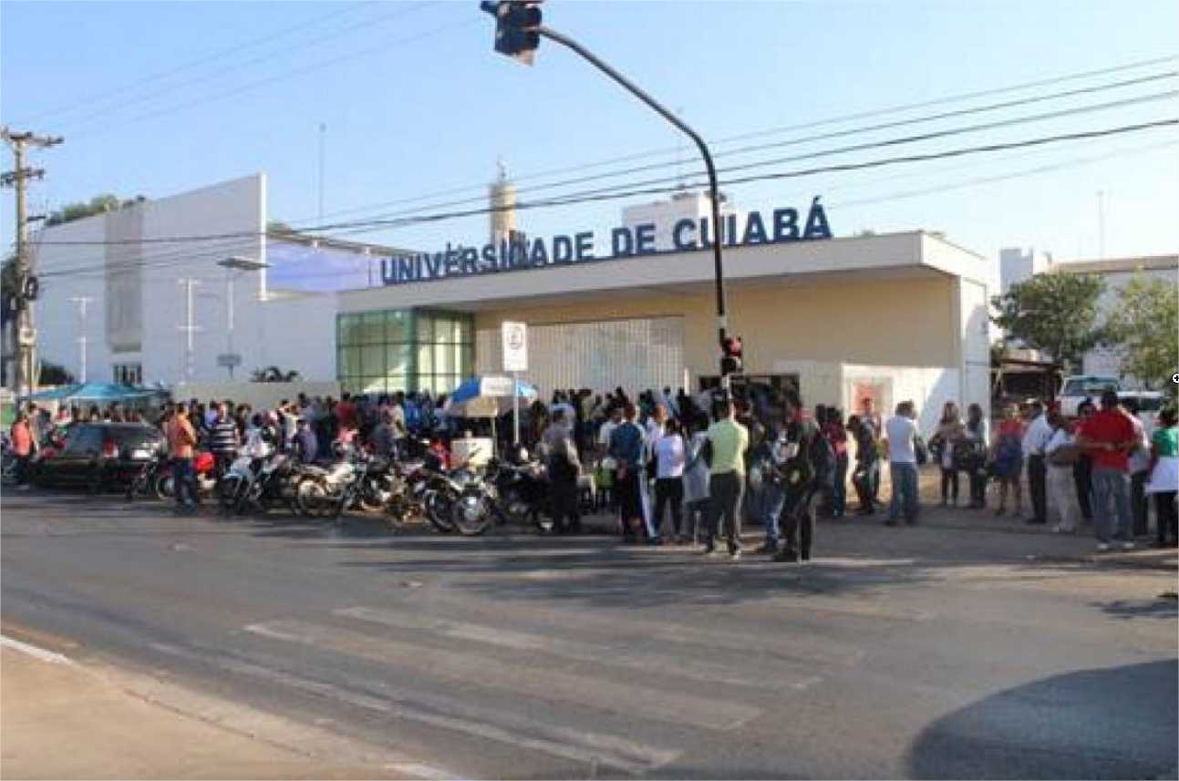 A foto mostra a fachada da Universidade de Cuiabá, local do evento, com o público em busca de uma vaga de emprego na Feira de Empregabilidade realizada no ano passado.