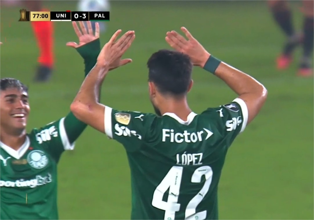 Cinco minutos depois, Flaco López tabelou com Vitor Roque, invadiu a área e bateu forte com a esquerda para marcar o segundo gol palmeirense.