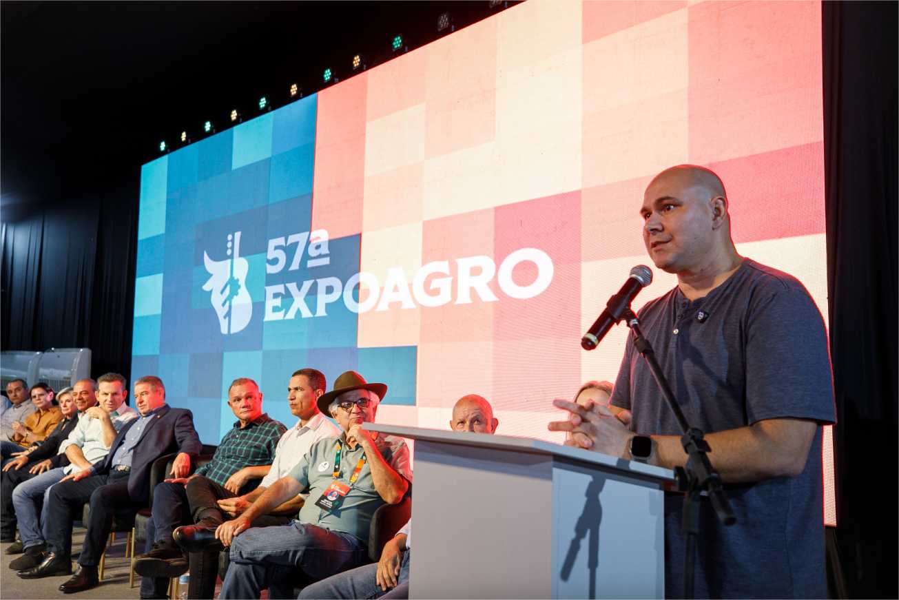 Na imagem principal, o prefeito está discursando em um púlpito para o público da Expoagro. Ao fundo, no auditório, estão autoridades como o governador, senador e líderes políticos de Mato Grosso.
