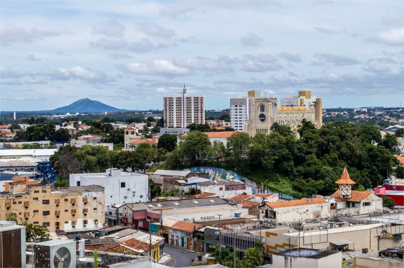 A imagem mostra uma vista panorâmica da cidade de Cuiabá, com diversos prédios baixos, algumas construções parecem antigas e comerciais. No centro da imagem, um morro coberto por árvores abriga uma grande igreja de arquitetura imponente, de paredes claras e grandes janelas. Mais ao fundo, vê-se uma área com edifícios residenciais altos e modernos e o morro de Santo Antônio.