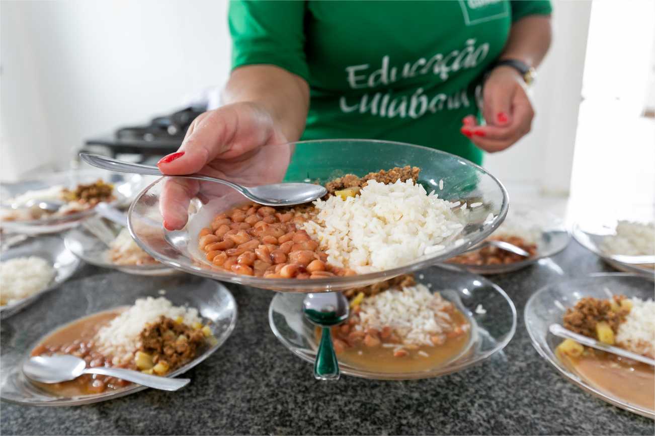 Na imagem, uma mulher segura um prato transparente com arroz branco, feijão e carne moída com legumes. Ela usa uma camiseta verde com a frase “Educação Cuiabana” estampada.
