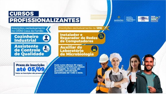 A Prefeitura de Diamantino, por meio da Secretaria Municipal de Assistência Social, Trabalho e Cidadania, em parceria com o Programa Ser Família Capacita, informa à comunidade que estão abertas as inscrições para cursos profissionalizantes gratuitos. As inscrições são presenciais e seguem até o dia 5 de setembro.