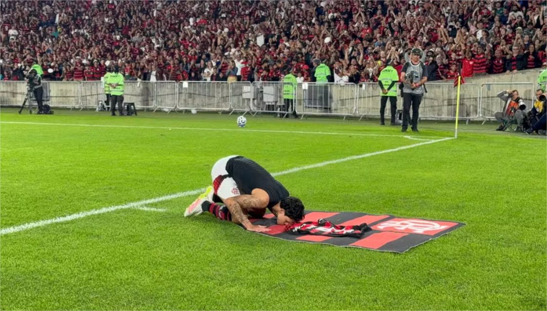 Depois de uma boa chance criada, veio o gol. Após cobrança de escanteio, Pedro fechou na segunda trave para abrir o placar. Na comemoração, Jorginho saiu animado e deu um recado no pé no ouvido do companheiro. O camisa 9 pareceu fazer quase um desabafo silencioso ao fechar os olhos para ter um momento só. Só abriu quando Léo Pereira deu tapinhas no rosto para celebrar. Os companheiros se uniram em volta dele em um momento que também teve dedos no ouvido e um beijo no escudo do Flamengo.
