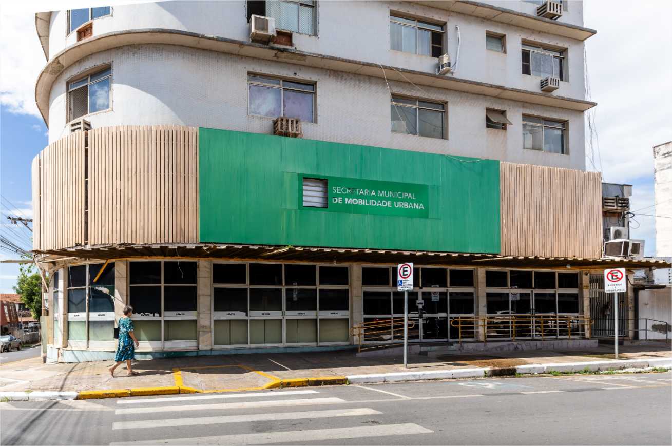 A foto mostra a sede da Secretaria Municipal de Mobilidade Urbana, em Cuiabá. Na fachada, em verde, a identificação do local.
