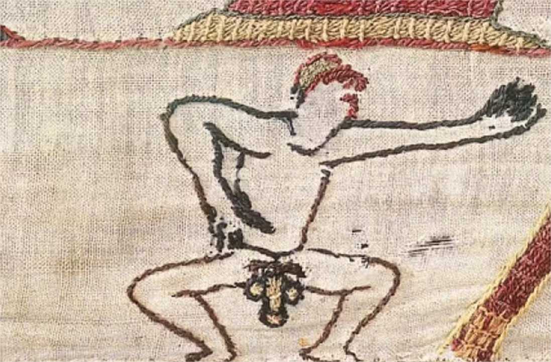 Para defender a sua hipótese, Monk destacou a utilização de um fio claro para a construção das estruturas circulares. Em outros pedaços do bordado, o mesmo material foi empregado justamente para desenhar os testículos e as glandes em outras figuras. É possível que os pontos pretos do eixo tenham sido feitos posteriormente, em um esforço de restauração da peça.