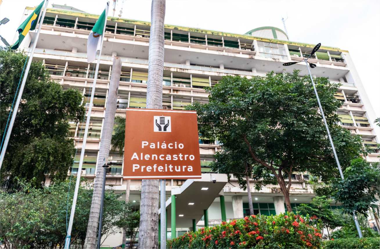 A imagem ilustra o Palácio Alencastro, prédio que abriga a Prefeitura de Cuiabá. Destaca-se uma placa marrom com a frase em branco “Palácio Alencastro Prefeitura”. Também aparecem árvores com folhas verdes em frente ao prédio.